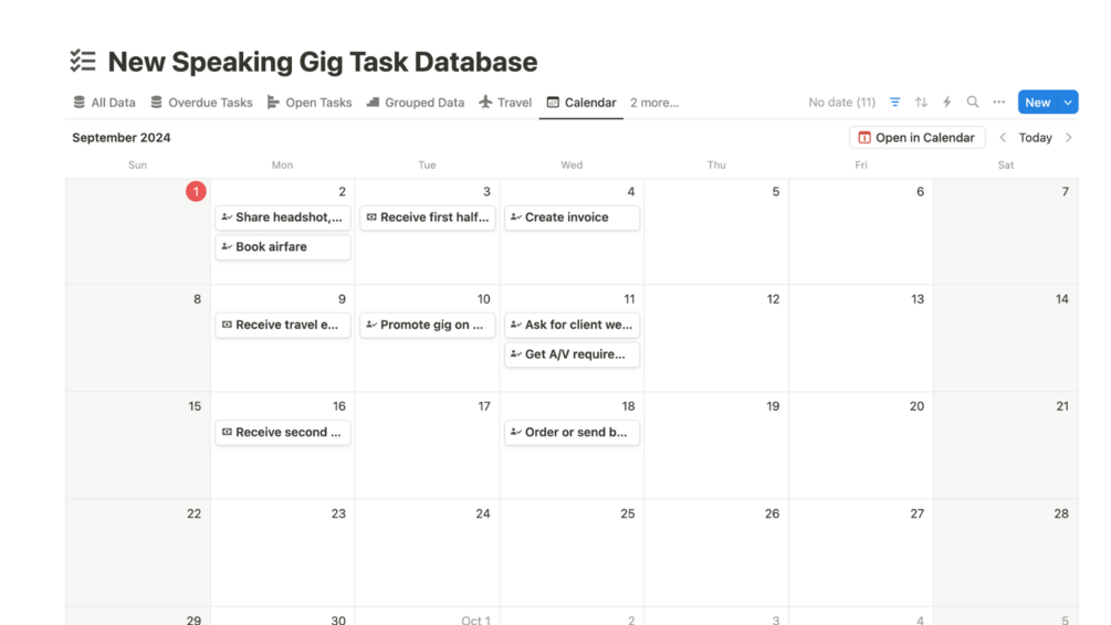 This simple database allows speakers to track all aspects of their gigs, including administration, travel, billing, expense reimbursement, and marketing. With a simple button, you can mark tasks as not needed.