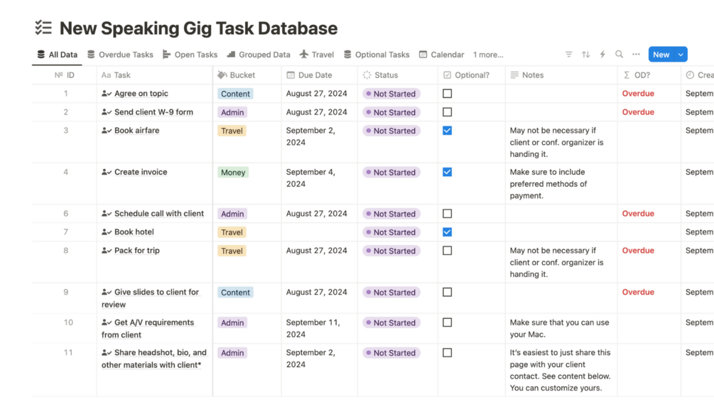 This simple database allows speakers to track all aspects of their gigs, including administration, travel, billing, expense reimbursement, and marketing. With a simple button, you can mark tasks as not needed.